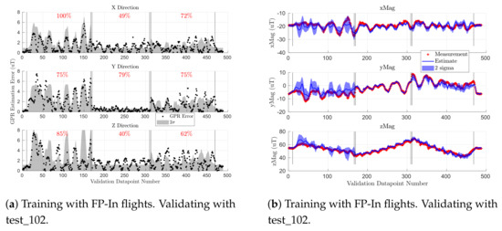 Figure 9 shows the accuracy of the indoor magnetic field map when trained on five indoor flight profiles (FP-In) and validated on a Scan- flight. The left plot is the GPR estimation error when validated on flight test_102, while the right plot shows the GPR estimates (blue line) against observations from the validation set (red cross). The results were qualitatively similar when validating on test_103. The blue and gray shaded regions depict two standard deviations of GPR uncertainty at each sampled location. The black vertical lines partition the figure into sections of constant altitude (0.5 m, 1.5 m, and 2 m, respectively). We used samples from test_105, test_107, test_110, test_112, and test_114 as shown in Table 3 to train the GPR on the FP-In trajectories. Figure 7 shows similar metrics for the indoor GPR-based map when trained on the lawnmower coverage pattern Scan-.