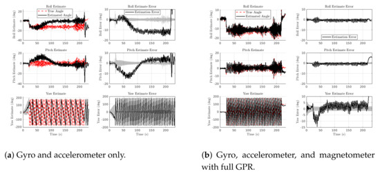 Figure 11b is the same flight, but now with the magnetometer. Here, we see that both the transient pitch error and the steady-state roll error were eliminated, demonstrating that the information from the magnetometer and the GPR-based map was able to improve roll and pitch estimates. This is important because, in many applications, the magnetic field is only used to provide yaw (heading) measurements, while roll and pitch are left to the accelerometer. However, with sufficient information of the magnetic field, magnetometers can also assist in correcting roll and pitch estimates.