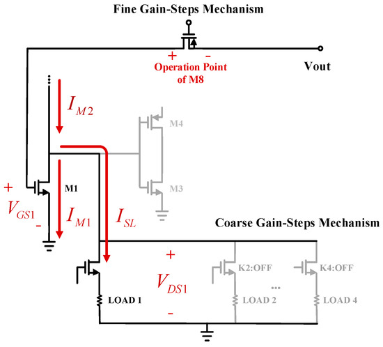 since all the parameters are kept fixed, else . Therefore, the gate voltage of M1 changes when varies, due to the selected load, to satisfy the current equation. On the other hand, variations in gate voltage of the M1 reflect the operating point of the M8. In conclusion, the operation point of the M8 is controlled indirectly through the selective loads as the IOPB technique. Despite the coarse-gain-step mechanism, for the fine-gain step mechanism, the operating point is adjusted with direct biasing through the gate of the M8.