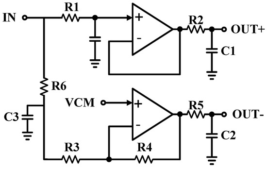 To convert the signal from the single to differential form, the SDA was designed, as shown in Figure 6. The SDA is placed after TIA and DCOC blocks in the AFE chain. The used structure is formed based on two-stage Operational Amplifiers (Op-Amps). VCM comes from the DCOC.
