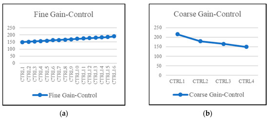 Gain of the TIA versus the (a) fine-gain controls and (b) the coarse-gain controls.