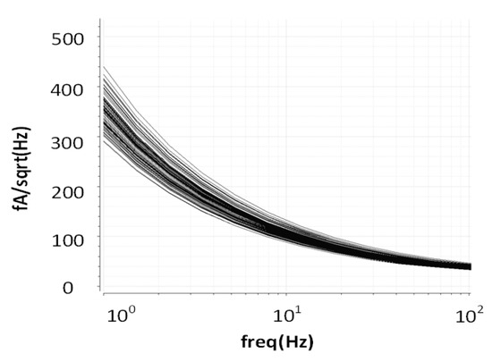The chip of the proposed fine-dust detection system is fabricated in a 0.18 µm standard CMOS process. The die size of the chip is 1100 µm × 1100 µm. To emphasize the low area occupation of the TIA, its top layout is shown in Figure 8. Post-layout simulations show a dynamic range of 42 dB with 16 gain-steps for the fine-gain steps, as shown in Figure 9a. Furthermore, coarse-gain-steps with a 67 dB dynamic range are shown in Figure 9b. Figure 10a,b show the gain of the TIA versus fine- and coarse-gain controls, respectively. The input-referred noise of the TIA, in all cases, is kept at less than 600 fA/√Hz and goes as low as 27 fA/√Hz at 20 kHz. A Monte-Carlo analysis provides a total input-referred noise with a 150 fA/√Hz variation, as shown in Figure 11.