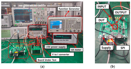 The chip-micrograph of the analog front-end is shown in Figure 13. A fine-dust detection sensor module is installed on the test board. The structure of the module consists of a laser beam and a photodiode that detects the variation of observed light from the laser beam when dust particles are passing through the module. The measurement setup of the proposed analog front-end is shown in Figure 14, which is formed by an oscilloscope, power supply generator, pulse controller, PC interfaces, the Device-Under-Test (DUT) board, and a voltage-to-current (V-I) converter to provide input currents for the TIA. The V-I converter is used to convert the input pulse from the pulse generator to the input current signals in the range of nano-amperes.