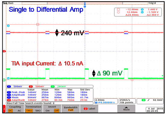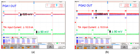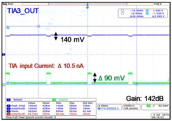 The measured gain of the TIA in the highest gain-mode is shown in Figure 15, which shows a 142 dB gain for the TIA when the V-I converter is delivering a 10.5 nA input signal to the TIA. Next, the output signal of every stage of the analog front-end is measured. Figure 16 shows the measured signal to a differential amplifier, providing the differential signal at the output. The amplified signal after the PGA1 and PGA2 is illustrated in Figure 17a,b. The performance of the TIA is compared with similar works in Table 1.