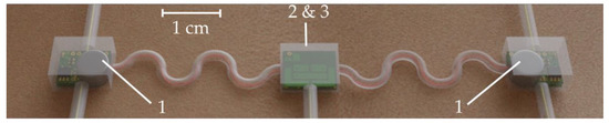 - Once the first layer was cured, the sensor system was placed and maintained in position while a second layer of PDMS was added. This layer was used to fix the sensors in its final position and to prevent them from moving during the final step (Figure 8c,d). Special care was taken to prevent the sensors from touching the mold and create a failure in the sealing;