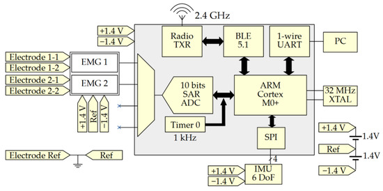 This part of the system comprises a low power DA14531 [35] chip from dialog semiconductor measuring 2.2 mm × 3 mm × 0.4 mm. It is a Bluetooth low-energy (BLE) 5.1 system-on-chip, embedding an ARM Cortex M0+ central processing unit (CPU). It contains a 4-channel 10-bit successive approximation (SAR) analog to digital converter (ADC) to acquire the two sEMG streams at 1000 Hz. The DA14531 also embedded a serial peripheral interface (SPI) bus used to communicate with the IMU at 24 MHz with an acquisition rate of 100 Hz. The data collected by the MCU are sent via Bluetooth or universal asynchronous receiver-transmitter (UART) every 100 ms. The selection of communication protocol is carried out during programming of the chip and either one or both can be activated simultaneously. Finally, two hearing aid A10 batteries connected in series are used to power the overall system. These batteries using a zinc-air reaction have a capacity of 91 mAh and measure 5.8 mm in diameter with a thickness of 3.6 mm. Their nominal voltage varies between 1.4 V at maximum charge and 1.2 V on discharge. Figure 3 shows a block diagram of the main processing unit and the connection with surrounding electronics.