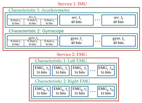 The first service, used to transmit the ten concatenated IMU values, contains two characteristics updated at a rate of 10 Hz. Each characteristic is dedicated to a sub-sensor of the IMU (the accelerometer or the gyroscope) and contains the 16-bit values of the three axes concatenated together over time, resulting in a stream of 960 bits length. The second service, used to transmit the hundred concatenated sEMG values, contains two characteristics also updated at a rate of 10 Hz. Each characteristic is dedicated to one of the two sEMG sensors and contains the sEMG 16-bit values concatenated over time, resulting in a stream of a 3.2 kbits length. Both services sum up to a transmission packet of 4.16 kbits.
