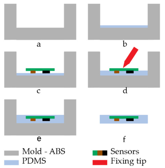 Figure 8. Packaging process: (a) design of the ABS mold, (b) addition of a first PDMS layer, (c) placement of the PCB, (d) locking of the PCB position, (e) filling of the mold, (f) unmolding of the PCB. - A first layer of PDMS was deposited onto the bottom of the mold. This prevented a contact between sensors and mold and thus an incomplete sealing (Figure 8b);