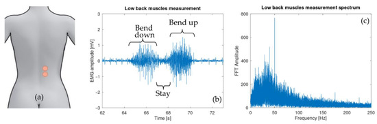 (a) Differential electrode placement. (b) Lower back muscle activity during exercise: bending forward, staying in position, moving back to the initial position. (c) Fast Fourier transform of the collected sEMG signal. This shows the usual sEMG spectrum with a reasonable 50 Hz contamination.