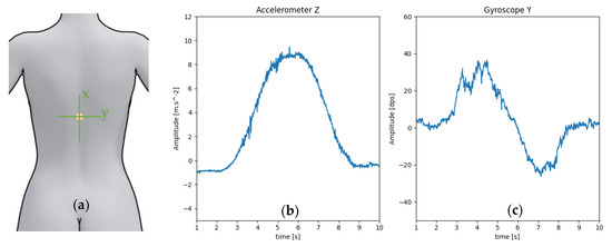The IMU was attached to the skin in the middle of the back at the height of the eighth thoracic vertebra T8 (Figure 11a). Over the six IMU signals acquired, the two relevant ones with regard to the test (z-axis accelerometer and y-axis gyroscope) are shown in Figure 11b,c.