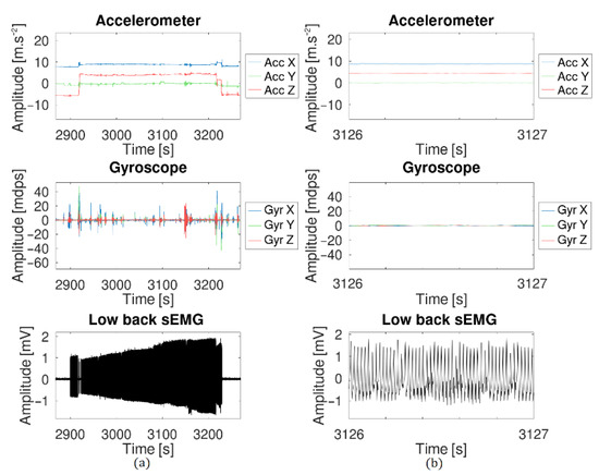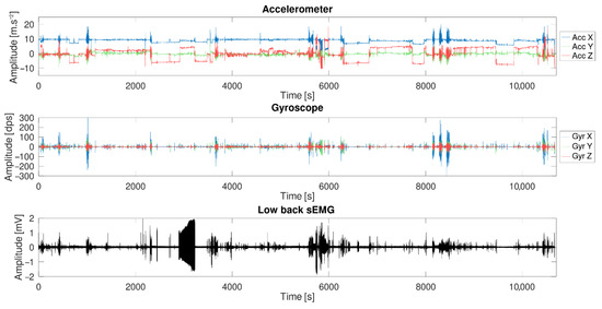 Long-term measurement (3 h) made with the sensor during a normal day: the complete acquisition data from one sEMG sensor and the inertial sensor.