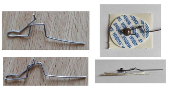 The standard way to connect disposable electrodes to patients is achieved via snap lead wire adapters, alligator clamps, or pre-wired electrodes. The drawback of these solutions is their thickness. The snap adapters are 6 mm thick and, once connected to the electrodes, the final assembly (electrode and connector) is 8 mm thick. The alligator clamps vary with different models, but because of the way they operate, it is not suitable for this project. There is a risk of opening the clamp if the patient sits against the backrest of a chair or lies on a bed. Finally, the pre-wired electrodes might seem to be a good solution, but they require a DIN-female connector measuring around 1 cm in diameter. For these reasons, a homemade system was developed and is shown in Figure 15. It consists of a 1-mm-diameter steel wire folded in the shape of a clamp with a locking system. The clamp is made to curl around the electrode tip. By using this connector, the final assembly is 4 mm thick, which is the thickness of the electrode.