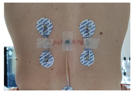 Electrodes were attached to low back muscle on a 29-year-old test subject with low subcutaneous fat amount (BMI around 20). They were placed on the erector spinae muscle at the height of the second lumbar vertebra L2 a few centimeters on the right side (Figure 10a). Figure 10b shows the sEMG signal after being digitalized and sent by the microcontroller. The spectrum of the acquired signal was also computed via the FFT algorithm provided by the GNU octave software [38].
