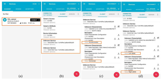 Screenshot of the “nRF connect” application [39] running on an android smartphone connection to the sensor system. (a) Detection of the sensor system. (b) The two services (IMU and sEMG) are detected. (c) The first service (IMU) contains the two characteristics representing the accelerometer and gyroscope value. (d) The second service (sEMG) contains the two characteristics representing the left and right sEMG values.