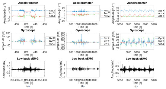 The long-term measurement provided good results although problems arose. Figure 19 shows three zoomed events selected from the complete measurement data. During the first one (Figure 19a), the test subject bent forward to find an object in a drawer. During the second event (Figure 19b), the test subject was walking in the house. Finally, the last event came from a stretching session during which one the test subject did a few squats.