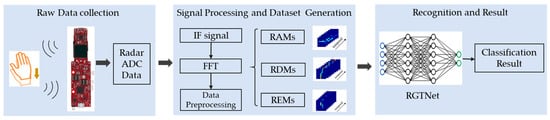 The gesture recognition system proposed in this paper mainly contains three parts: data acquisition, signal processing and dataset generation, and gesture recognition algorithm, as shown in Figure 1. We design several typical gestures in the in-vehicle environment for data acquisition. Then, we use radar signal processing and data preprocessing to obtain our dataset, which includes RDMs, RAMs, and REMs of different gestures. In the recognition stage, we train the proposed RGTNet to complete the gesture classification.