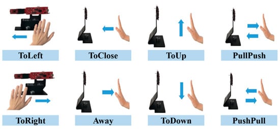 In this paper, we design eight types of hand gestures: ToLeft, ToRight, ToClose, away, ToUp, ToDown, PullPush, and PushPull, as shown in Figure 4. We had a total of six subjects, each in a group of two, in the driver’s and co-driver’s seats for data collection. During data acquisition, we ensured that each gesture was made complete, and the speed of each gesture was moderate. Each gesture was completed in about 2 s, with the speed range of 0.1 m/s–0.5 m/s and the distance from hand to the radar of between 0.1–0.9 m.