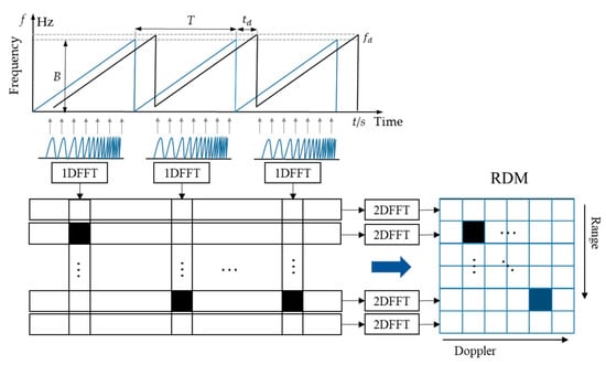 The MMW radar signal processing includes two processes: analogue-to-digital conversion and digital signal processing []. First, the radar transmits the chirp signal through three transmitting antennas. The transmitted signal is expressed as