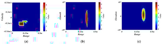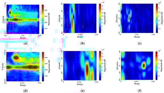 To reduce the difficulty of network training and prevent interference from the rear passengers and invalid regions, we crop off the redundant sizes of radar feature maps to obtain the ROI. The gesture recognition considered in this paper is applied in the vehicle, where the primary users are the driver and the co-driver. Therefore, the maximum recognition range of the radar is selected as 0.9 m, which can cover the front areas. Since the gesture speed is moderate and the whole gesture takes about 2 s, the maximum radar recognition speed is selected as 0.54 m/s. As for the detection field angle of radar, we empirically choose the horizontal angle and elevation angle to be −48°~48°. Figure 7a–c are the original RDM, RAM, and REM of a frame belonging to close gesture, respectively. The ROI extraction results of RDM, RAM, and REM are shown in Figure 7d–f, respectively.
