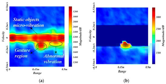 Due to the mechanical parts jittering and road inequality, the vehicle will produce a certain degree of vibration under driving or idling conditions. The vibration can affect the intensity distribution of the range-Doppler map. In the range-Doppler map, the vibration is mainly concentrated in the interval of −0.2–0.2 m/s, which mainly shows the abnormal high-intensity regions caused by vibration. We should remove these vibrational noises and micro-motions of static objects to prevent them from interfering with gesture features.