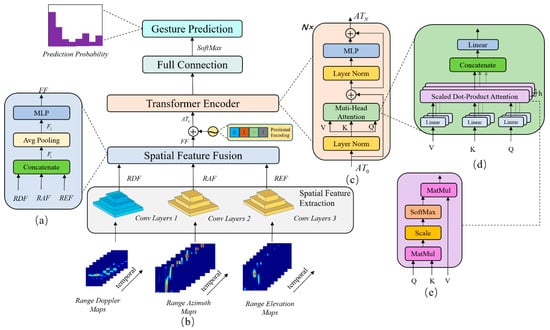 - We propose a transformer-based network architecture for radar gesture recognition, RGTNet. The spatial feature extraction and spatial feature fusion modules are designed to embed the input of the time-sequenced radar feature maps. We take the temporal information between frames into account by positional encoding. A transformer encoder based on VIT [] is used to extract the deep temporal feature associations between different frames. Finally, the probability prediction is completed by the fully connected layer and softmax operation.