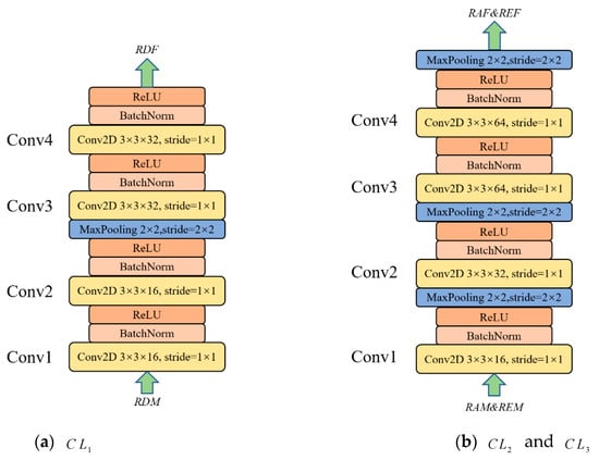 The inputs of the spatial feature extraction module are RDMs, RAMs and REMs, where , , . Each modality is consecutive frames. For RDMs, each frame has a size of with channels. The RAMs and REMs are similar. We use three independent convolution layers for spatial feature extraction with a structure similar to VGGNet [], i.e., a 3 × 3 convolution and pooling layer with batch normalization and ReLU activation function. The Conv Layers2 and Conv Layers3 use the same structure since the RAMs and REMs are of the same size. However, their parameters are not shared. Figure 13 shows the structure of Conv Layers1 (), Conv Layers2 () and Conv Layers3 ().