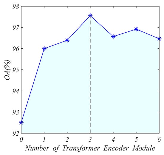 In our network, the number of transformer encoders is an important parameter. More encoders mean deeper feature extraction, but it brings more parameters and makes the model more complex. We set the number of transformer encoders from 0 to 6. The accuracy of the test set is shown in Figure 16. When there is no transformer encoder module (i.e., only 2DCNN is used to extract features), the accuracy of the test set is low. As the number of encoders increases, the accuracy of the test set gradually increases. When is 3, the accuracy is the highest, and then the accuracy does not increase. Therefore, the prediction accuracy and complexity of the model reach a good balance when is 3.