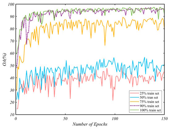 To fully validate the effectiveness of the proposed method, we analyze the performance of the proposed method under the different sizes of the train set. We train the network using 25%, 50%, 75%, and 90% of the train set and compare the results with the previous training using the entire dataset. The overall accuracy curve of the test set with the training epoch is shown in Figure 17. We can see that the accuracy of the model quickly reaches the bottleneck on the small training set, and the results are not very stable, with more significant oscillations. With the increase of training data, the accuracy of the test set increases. When the training set is 90%, the network performance is generally consistent with the results obtained from the entire data set. It indicates that our network has good expressiveness and generalization performance.