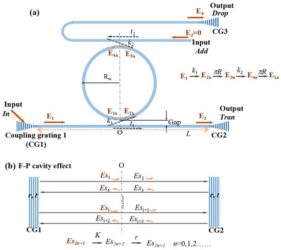 Silicon photonics has become one of the most promising photonic integration platforms in recent years [1,2]. This can be mainly attributed to the combination of a very high index contrast and the availability of complementary metal-oxide-semiconductor (CMOS) fabrication technology, which allows the use of electronics fabrication facilities to make photonic circuitry [3,4,5]. As a typical integrated on-chip optical device, the micro-ring resonator (MRR) is widely used as a wavelength selective device in the field of sensing, e.g., temperature [6,7,8], humidity [9,10,11], and refractive index [12,13,14], due to its high-quality factor, narrow bandwidth, high integration, and other advantages. There are high requirements for the accuracy of the selected wavelength, including the peak intensity and position of the resonant peaks of MRR transmission. At this stage, there are a lot of works and experiments about the wavelength selection characteristics of MRR, and we notice that there are different degrees of miscellaneous peaks in the resonance spectrum of MRR transmission [15,16,17]. Compared with the resonance peaks of MRR, the miscellaneous peaks are disordered and relatively dense. The existence of these miscellaneous peaks inevitably affects the accuracy of wavelength selection, which leads to errors in the data analysis and processing results [18,19,20]. In the related experiments of MRR, Wirth et al. analyzed the source of the miscellaneous peaks and verified the existence of the Fabry–Perot (F-P) cavity [17]. Chao et al. analyzed the experimental results and showed that there is the F-P cavity effect, and compared with the transmission port, the background oscillation of the download port is smaller [18]. However, the corresponding work only states that the cause of the miscellaneous peaks may the formation of an F-P cavity between the waveguide grating couplers, and it lacks detailed theoretical analysis and experimental verification [17,18,19,20].