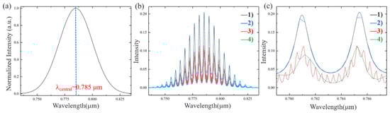 (a) Gaussian incident light with a center wavelength of 785 nm. (b) The output of Drop (1) without F-P cavity effect (Δλ = 0.1 nm); (2) without F-P cavity effect (Δλ = 0.4 nm); (3) with F-P cavity effect (Δλ = 0.1 nm); (4) with F-P cavity effect (Δλ = 0.4 nm). (c) Partial enlarged view in the wavelength range of 779 nm–787.5 nm.