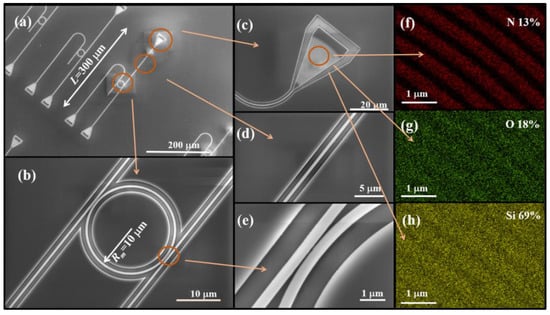 To verify the above theoretical analysis, add-drop MRR samples with different radii and coupling gaps with the bus-waveguide were fabricated with electron beam lithography and reaction ion etching. Figure 3a–e present the scanning electron microscope (SEM) images of the fabricated Si3N4 waveguide structure. The length of the waveguide L is 300 µm ± 3 µm and the radius Rm is 10 µm ± 0.1 µm. Figure 3f–h are the energy depressive spectroscopy (EDS) images of the fabricated Si3N4 waveguide structure material. The results show that the waveguide material is Si3N4 and the substrate material is SiO2. The mass percentages of N, O, and Si in the measured grating region are 13%, 18%, and 69%.