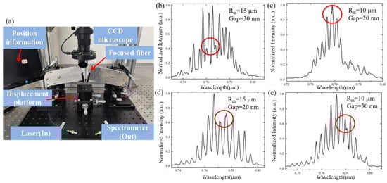 (a) Schematic diagram of test platform. (b) Rm = 15 µm, Gap = 30 nm, (c) Rm = 10 µm, Gap = 20 nm, (d) Rm = 15 µm, Gap = 20 nm. (e) Rm = 10 µm, Gap = 30 nm.