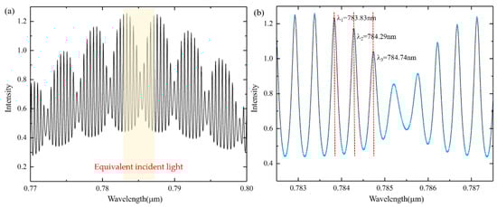 The wavelength resolution is improved to 0.01 nm. The simulation results of the equivalent incident light of F-P cavity effect in the wavelength range of 770–800 nm are shown in Figure 5a. Figure 5b shows the detailed information of the wavelength range of 782.5–787.5 nm when Δλ is 0.01 nm. The simulation results show that the equivalent incident light of F-P cavity effect has free spectral range (FSR) and is the same as the standard F-P cavity formed by the two end grating couplers. With the same parameters, the FSR of the equivalent incident light and standard F-P cavity is equal to 0.46 nm (λ1 = 783.83 nm).