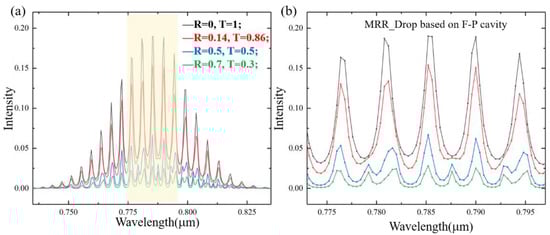 The F-P cavity effect will be different due to different interface reflectivities of grating couplers. To characterize the F-P cavity effect, we set γ(λ) to represent the intensity error value at the resonance wavelength, γ(λ) = (IMRR − IFP-MRR)/IMRR, where IFP-MRR and IMRR are the signal intensity with and without F-P cavity effect, respectively. The intensity error value of multiple resonance wavelengths is calculated by γ(R) = (γ(λ1) + γ(λ2) + … γ (λn))/n. We simulate the Drop signal under different reflectivities R (0/0.14/0.5/0.7), where R = 0.14 is the reflectivity of the interface between air and Si3N4, and the results are shown in Figure 6.
