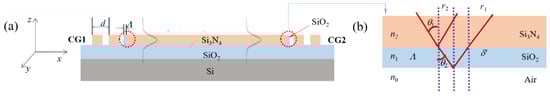 A layer of anti-reflection film with a refractive index between air and Si3N4 is introduced on the side wall of the grating coupler (there is the same procession to CG2), as shown in Figure 7a. The grating period is d, and the thickness of the anti-reflection film is Λ. Figure 7b shows that the phase difference between the two reflected lights is δ′ (δ′ = 2π (2nΛ)/λ). The reflection coefficients at the two interfaces are r1 and r2, which are expressed as: