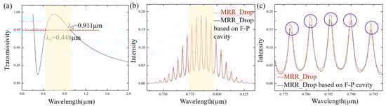 According to the air refractive index (n0 = 1) and Si3N4 refractive index (n2 = 2.4), the ideal refractive index of anti-reflection film is 1.549. However, in fact, we cannot find the material with exactly the same refractive index, so we use SiO2 as the material to prepare the film, and nSiO2 is 1.45. According to Equation (19), we set the thickness of SiO2 anti-reflection film as 150 nm, and the simulation results of its transmission spectrum are shown in Figure 8a. When the wavelength range is 0.448~0.911 µm, the R′ is less than 0.05. According to Equation (16), when R′ = 0.05, the simulation results of Drop signal with and without F-P cavity effect are shown in Figure 8b, and the partial enlarged view is shown in Figure 8c. According to Section 3.1, the resonance wavelength intensity error value γ (0.05) is 11.08%, and the influence of waveguide F-P on the MRR output signal is almost nonexistent.