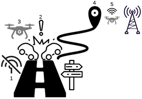 We assume in our work that the UAV is attached to a vehicle, and it detaches from it when a triggering event happens, such as a rapid and sudden change in the acceleration of the vehicle. Once an accident is confirmed, the UAV checks to see whether it is located within a coverage hole or not. If it is located within a communication network, it sends a distress message directly to the emergency response center. Otherwise, it flies to a location where a communication network is accessible and sends the distress message accordingly. Figure 1 shows an application of our proposed solution. First, two vehicles enter a coverage hole area where the communication service is not available. Second, an excessive change in the vehicle acceleration is detected by the UAV. Third, the UAV detaches itself from the vehicle right after the prediction of the accident. Forth, the UAV searches for the closest location with an access to a communication service once the collision is confirmed. Finally, the UAV sends the distress messages to the emergency center.