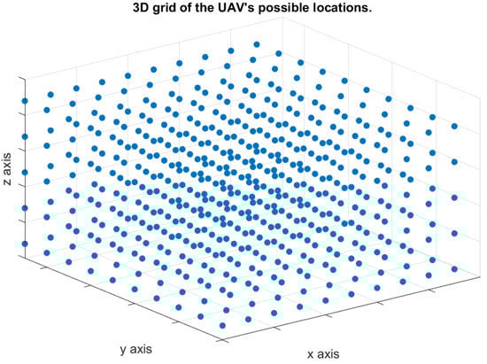 We consider a UAV serving as an automatic emergency dispatcher for a vehicle located at a coverage hole. Two base stations are located far away from the UAV, where their locations in the three-dimensional spaces are (8000, 0, 20) and (8000, 8000, 20). Based on the location of the base stations, we derive the path loss map. We use a three-dimensional space, 5000 m × 5000 m × 250 m, to model the path loss map. To study the effect of the number of points in the path loss map on the computational time, we consider two different grid sizes: (1) dense grid and (2) sparse grid. The dense grid, shown in Figure 4, consists of 500 path loss points (10 × 10 × 5 points, with a vertical/horizontal spacing of 50/1000 m). On the other hand, the sparse grid, shown in Figure 5, consists of 125 path loss points (5 × 5 × 5 points, with a vertical/horizontal spacing of 50/500 m).