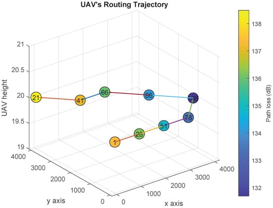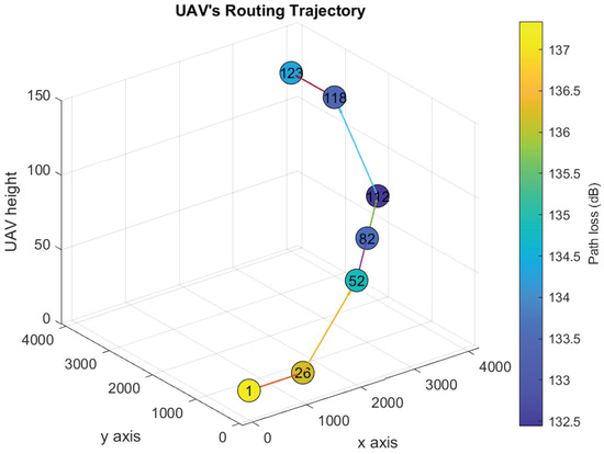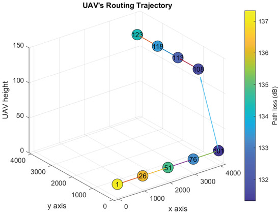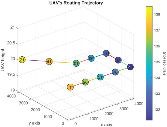 UAV’s trajectory design over the path loss map using Algorithm 1 (Scenario 1).