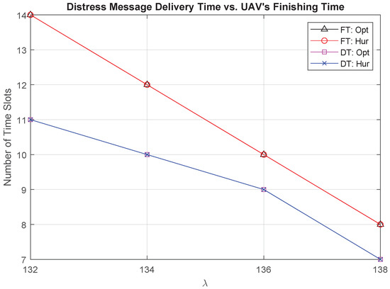 We present the relationship between the threshold and the distress messages Delivery Time (DT) and the UAV Finishing Time (FT) in Figure 10. DT is the time slot during which the UAV delivers all distress messages, where FT is the time slot that the UAV finishes its task and returns to its final location. It is shown that the solution of Algorithm 1 is similar to the optimal under different values for . As we increase the value of , the UAV has more chances to reach to a closer location with an access to a communication network. Therefore, the UAV can deliver the distress messages and return to its final location within a shorter time. Moreover, the gap between DT and FT decreases when increases as the UAV will have more options to go to locations in the direction of the final location to deliver the distress messages.