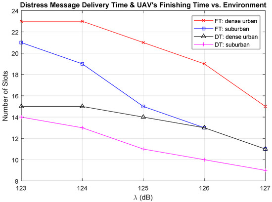 We present the effect of the environment on DT and FT in Figure 11. Given a certain location in the path loss map, the path loss value in the dense urban environment is higher compared to the path loss value in the suburban environment. Therefore, DT and FT are shorter in the suburban environment. The gap between the solutions under these different environments is large, where the FT in the suburban environment is similar to DT in the dense urban environment. From Figure 10 and Figure 11, we observe that the value of the threshold and the environment where the UAV flies can significantly affect the required time to send the distress messages. The selection for the value of depends on the quality of service requirement, the environment where the UAV flies, and the delay tolerance for delivering the distress messages.