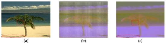 Li,j, ai,j and bi,j are the pixel values in the Lab color space, and i and j are the row and column coordinates of the pixels, which is an R × R region around the feature points. In fact, the Formulas (5) play the role of the image mean filtering, and the filter window is R × R. The filtering can effectively smooth the image, reduce the complex and redundant texture features and highlight the primary contour features. According to Figure 2a,c, the spiculate margin of the leaves in the rectangular box and the shadows of the trunk in the ellipse box are smoothed and filtered. The Lab color space image and the feature points are shown in Figure 2b. The number of feature points is N = 320 × 240/R2. (R = 6 as an example in this section).