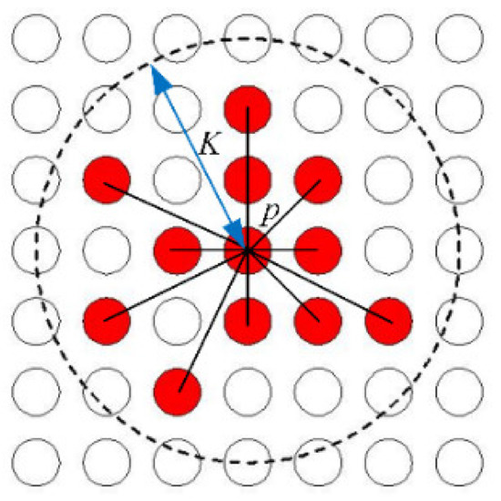 The density-based clustering method is used in this paper [15]. The density schematic diagram of each point is shown in Figure 3. The red center point is the point p whose density will be calculated. The other red points in the K-neighborhood are the points whose color and brightness features are similar to p. The density value of p is the sum of the red feature points that in the K-neighborhood. Therefore, the greater the point density, the more similar the color in its neighborhood.