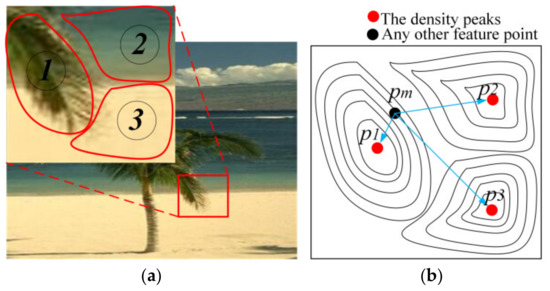 There must be at least one feature point whose density is higher than the neighborhood points; for example, the red points in Figure 4b are defined as density peaks in this paper. The density peaks will be probability defined as the cluster center. According to the densities, the other points could be distributed among the density peaks, and they can be described as the contour maps. For example, pm is one of many other feature points, and if the density of pm is close to p1 and the distance between them is also closed, the point pm and p1 will be segmented in the same superpixel with high probability.