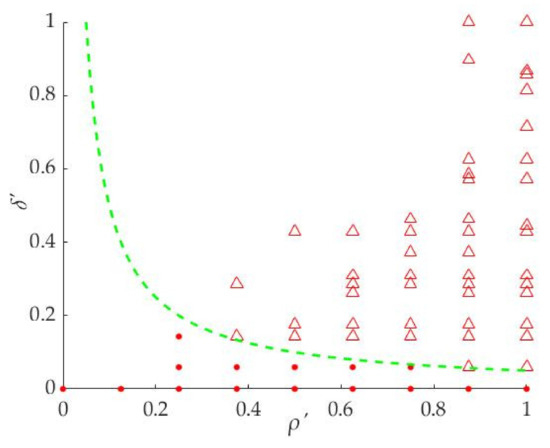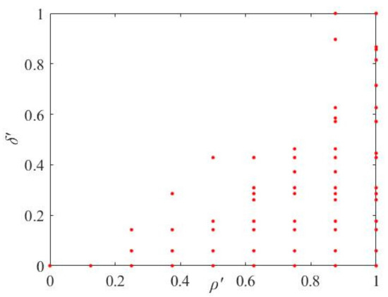 Ρ′ and δ′ are the normalized parameters, ρmax and ρmin are the maximum and minimum values of ρ, δmax and δmax are the maximum and minimum values of δ. In order to analyze how to extract the cluster center, Figure 2 is used as an example. The neighborhood parameter K and the threshold parameter ψ are assigned firstly, with K = 1.3R and ψ = 13 as an example. Then the ρ′–δ′ coordinate system will show the distribution of all the feature points in Figure 5.
