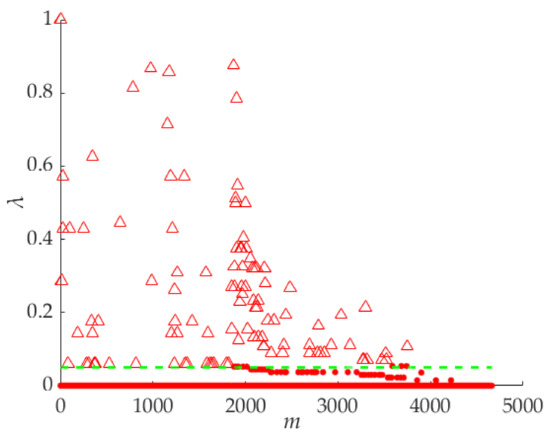 The parameter λ in Equation (11) is a comprehensive parameter of the ρ′ and δ′. The greater the value of λ, the greater the probability that the points are the cluster centers. All the points are shown in the m–λ coordinate system in Figure 7. The values of the m-axis are the serial number of all the points. We take λ = 0.005, for example, and the points on the upside of the function curve are the cluster centers.