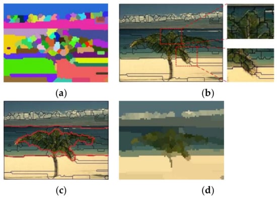 The clusters in Section 3 are actually the pixel blocks, and they are used for superpixel segmentation. The image in Figure 2a is used as an example for the superpixel segmentation experiment. According to the method in Section 3, the initial value should be assigned to the parameters R, K, ψ and a; for example, if R = 6, K = 1.3R, ψ = 13 and a = 0.005. The results of the cluster are shown in Figure 8a with the color blocks. Actually, the blocks are the superpixels. Figure 8b shows the boundaries of the superpixels, and the primary textures and contours of the objects are drawn very well by the boundaries. In addition, the skyline, the shoreline and the outline of the tree can be drawn with the red lines that are drawn by concatenation of superpixel boundaries in Figure 8c. The image can be segmented into four regions by the red lines representing the beach, the sea, the sky and the tree. Figure 8d is a superpixel image, and it is clear that the image can not only draw the salient objects well, such as the beach, the sea, the sky and the tree, but can also reduce the redundant complex textures of the image, such as the spiculate margin of the leaves.