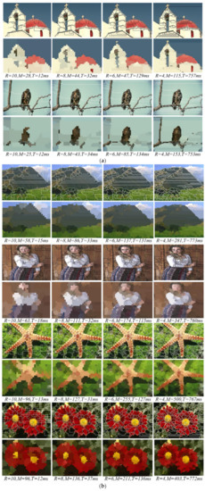 In order to analyze the superpixel segmentation results with the proposed method, the Berkeley database BSDS500 is used in this paper, and the sample images are resized to 320 × 240. The experiments are performed when R = 4, 6, 8 and 10, respectively. The superpixel segmentation results are shown in Figure 9. It can be seen from the segmentation results that the smaller the R is, the better the boundaries adherence is, and the clearer the textures and boundaries of the objects. It can be found that regardless of the value of R, the superpixels can depict the salient objects every well, such as the eagle, starfish, flowers and people. (The method was tested on a computer with an Intel i5 @ 2.5 GHz processor with 4 GB RAM).