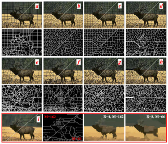 According to the shape and size of the superpixels, the superpixel methods can be divided into two cases. For example, the typical and well-known methods, such as the Lattice, ERS, SLIC and LSC, could produce regular superpixels. The irregular superpixels with sawtooth boundaries would be obtained by methods such as SEEDS, EneOpt1, quick shift and ERS. The segmentation results of them [8,16] are shown in Figure 11a–h. The number of the superpixels in the upper left and lower right parts in image are approximately 400 and 200, respectively. In order to obtain the similar segmentation results, we take R = 4 and 8 for segmentation, and the results of the proposed method are shown in Figure 11i. The numbers of superpixels are M = 162 and M = 66 in the upper left and lower right parts.