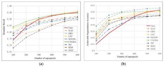 A comparison of each superpixel segmentation method is proposed in Figure 12. It is clear that the BR and ASA of the proposed method have good results. Specifically, the BR can achieve satisfactory results with a smaller number of superpixels (M = 300), and it is more than 90%. That is better than most of the classical and the state-of-the-art superpixel segmentation methods and it is 95.0% when M = 600. If the number of superpixels is too small, the results of the ASA are inferior to other methods. However, as the number M increases, the results of the ASA improve quickly. The ASA is 96.3% when M = 600, and it is better than most of the methods.